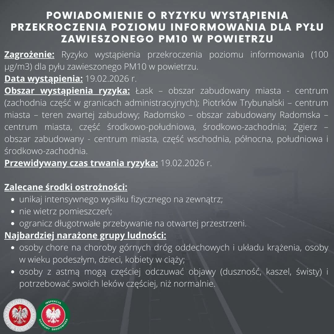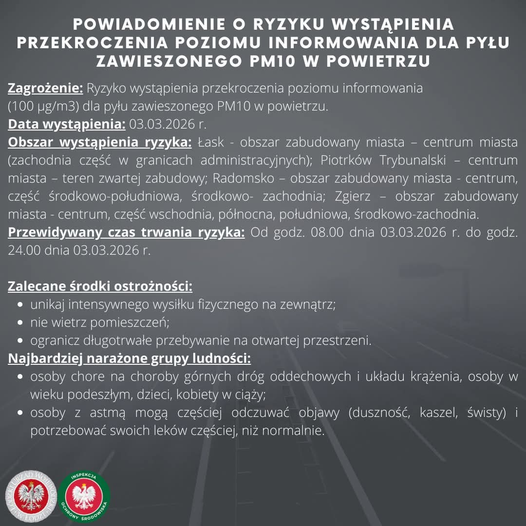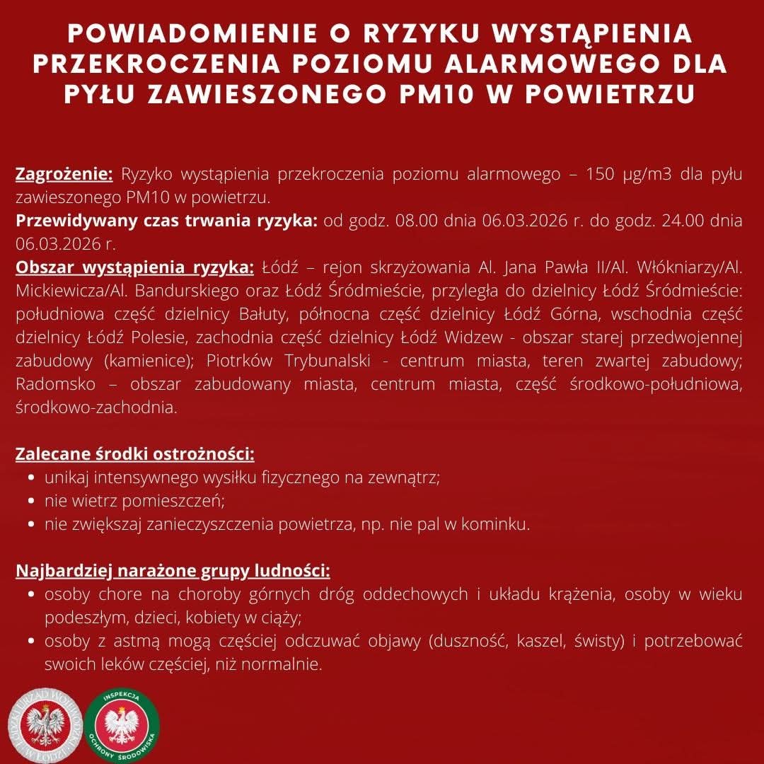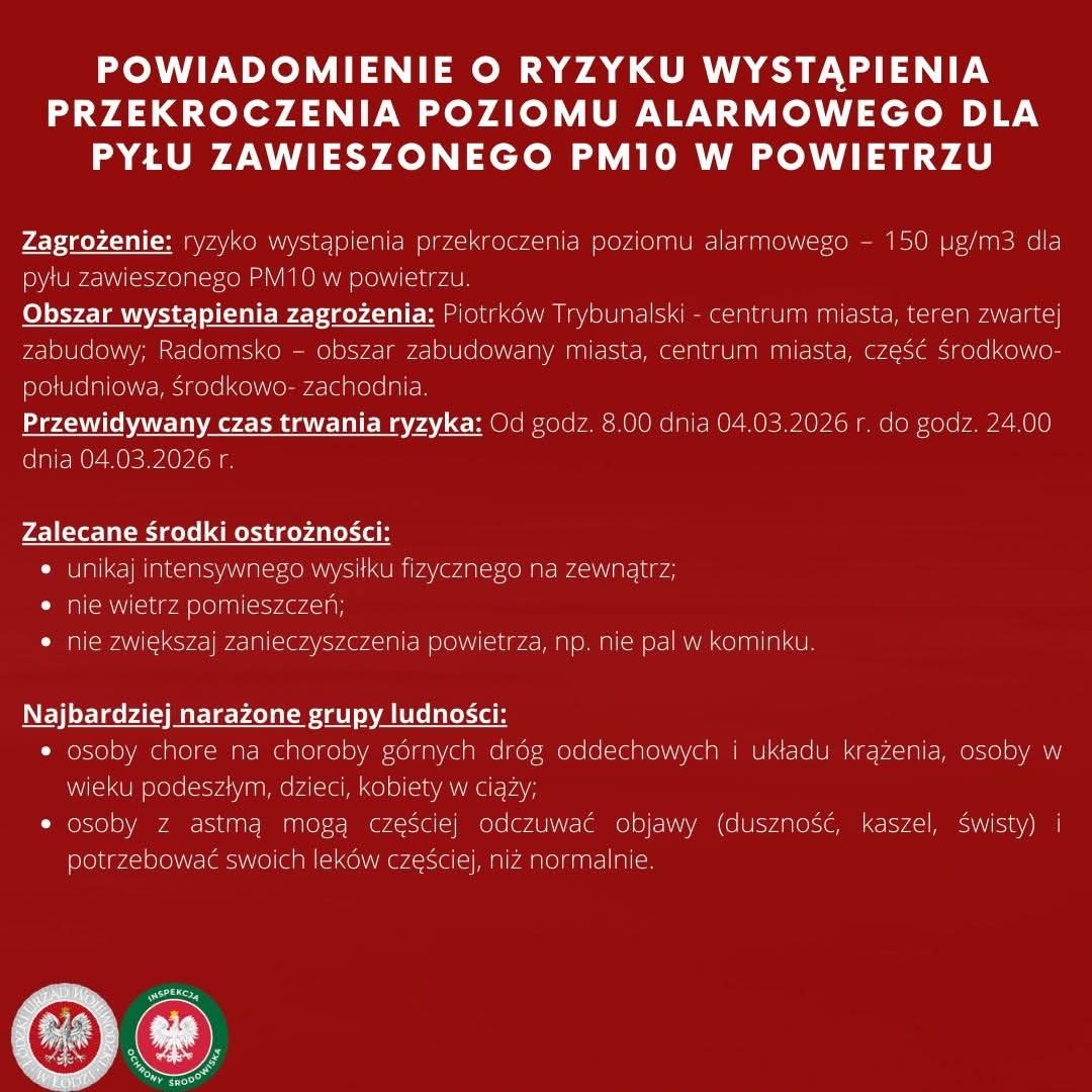 POWIADOMIENIE O RYZYKU WYSTĄPIENIA PRZEKROCZENIA POZIOMU ALARMOWEGO DLA PYŁU ZAWIESZONEGO PM10 W POWIETRZU.